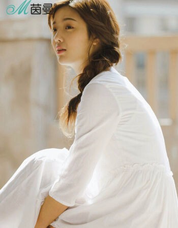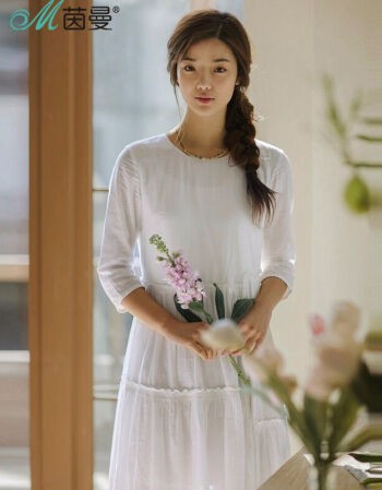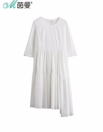 茵曼2017春女装连衣裙长袖蕾丝绣花套装宽松时尚水洗印花裙子长款 米白色 M