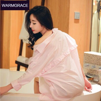 warmgrace2017年春季新款男友衬衫睡裙 性感女士长袖纯棉睡衣 居家休闲女 粉红色 均码